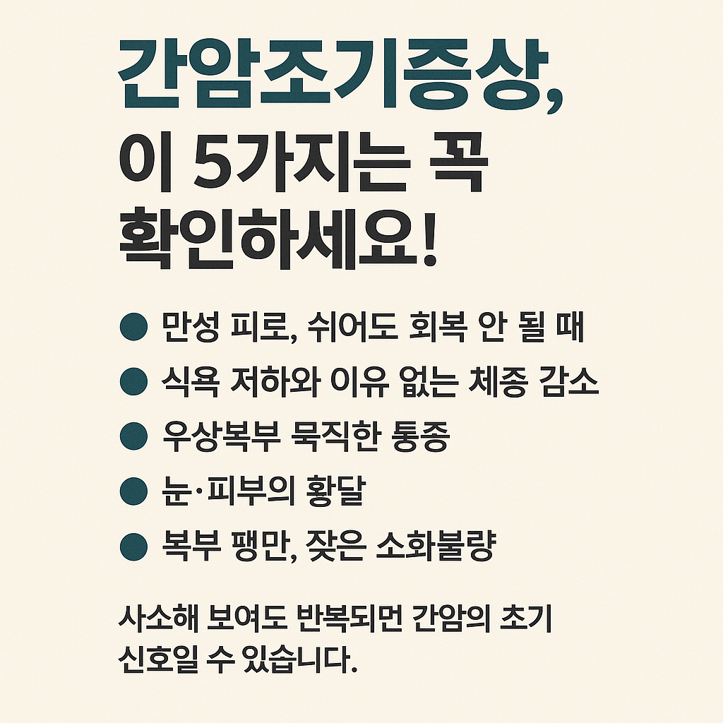 간암초기증상은 조기에 알아차리기 어려운 경우가 많아 정기적인 검진과 함께 자가 진단 체크가 중요합니다. 본 글에서는 2025년 최신 보건 정보 기준으로 간암 초기 증상과 함께 간암에 좋은 음식에 대해서도 실질적인 정보를 제공합니다.