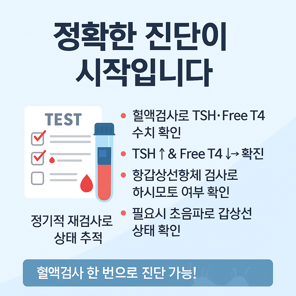 갑상선기능저하증은 호르몬 수치의 변화를 정량적으로 파악할 수 있는 몇 가지 혈액검사를 통해 진단할 수 있으며, 원인 파악을 위한 보조 검사도 함께 이루어집니다. 특히 증상이 모호하거나 자각이 어려운 경우가 많아, 정확한 진단을 위해서는 체계적인 검사가 필요합니다.