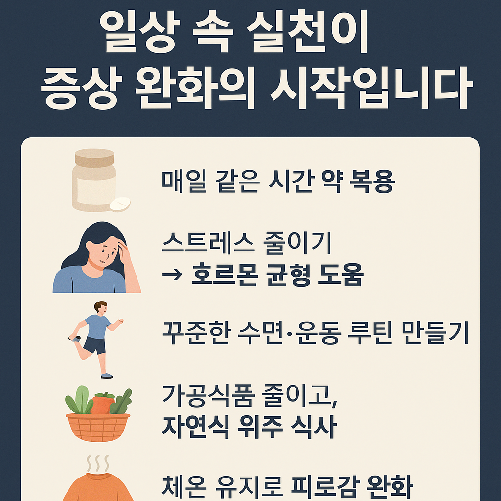 | 건너뛰거나 복용 시간 매일 다름 | 호르몬 수치 불안정 → 피로, 체중 증가 등 재발 |