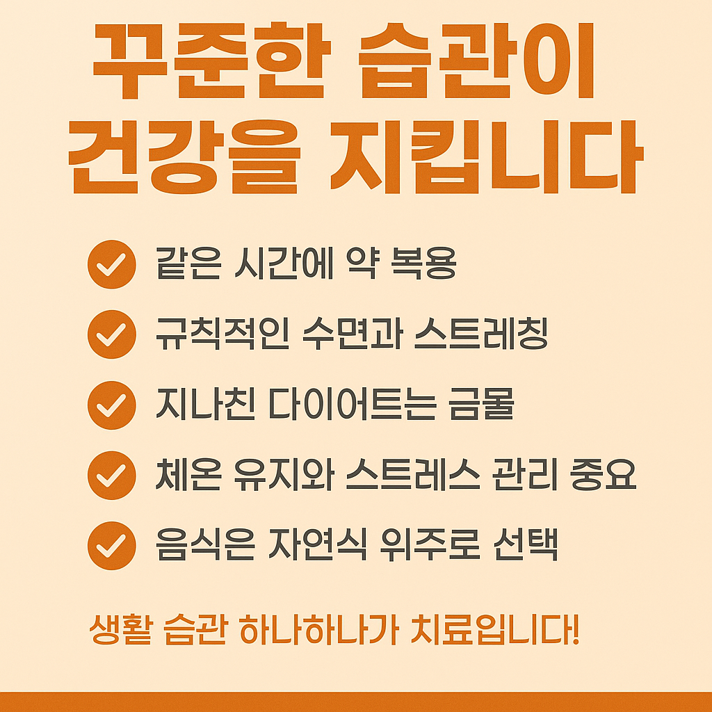 갑상선기능저하증은 생활 습관의 작은 변화가 증상 완화와 재발 방지에 큰 영향을 미치는 질환입니다. 복용법, 식사, 운동, 수면의 네 가지를 자신의 생활 리듬에 맞게 꾸준히 실천하면, 건강한 일상을 유지할 수 있습니다.