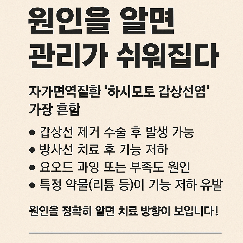 | 자가면역질환 | 하시모토 갑상선염이 가장 흔한 원인으로, 면역세포가 갑상선 조직을 공격하여 호르몬 분비를 저하시킴 |