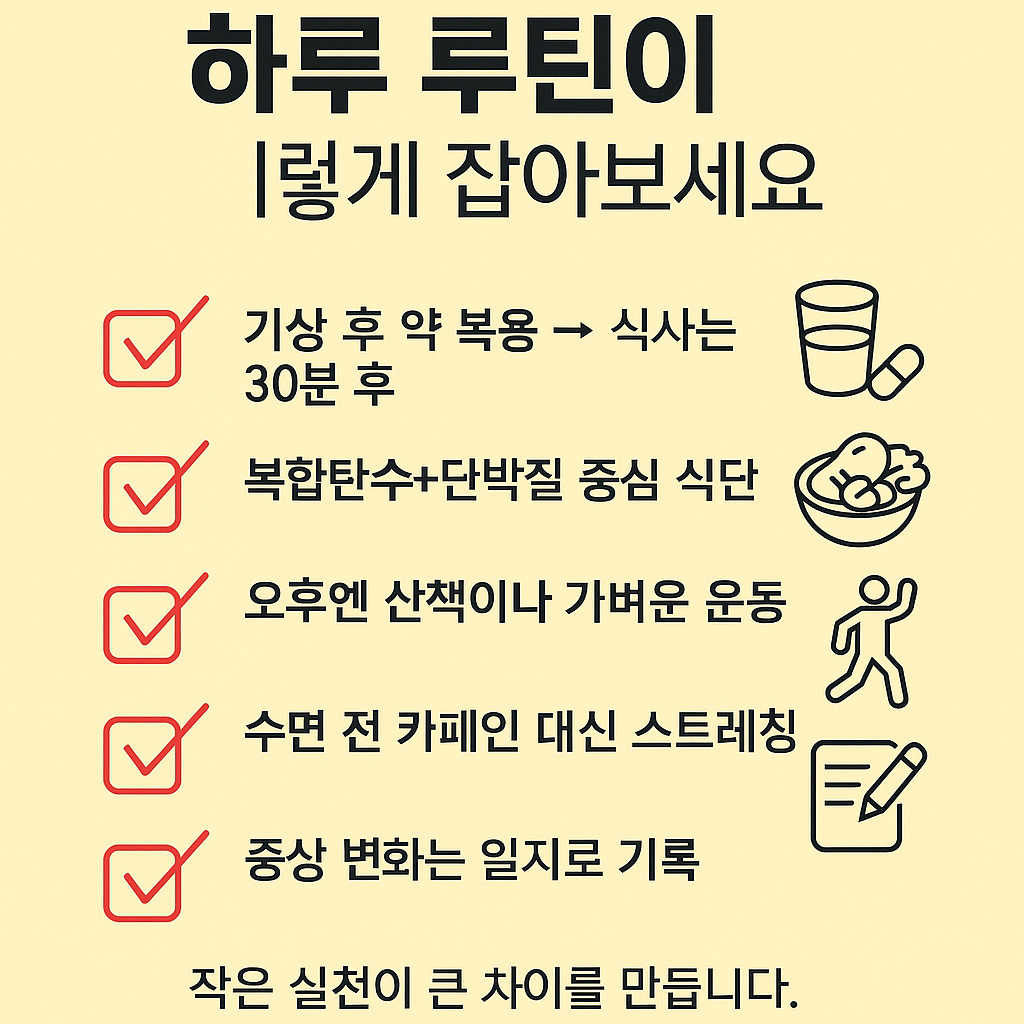 | 약 복용과 간격 유지 | 아침 공복 복용 후 최소 30분 후 식사 |