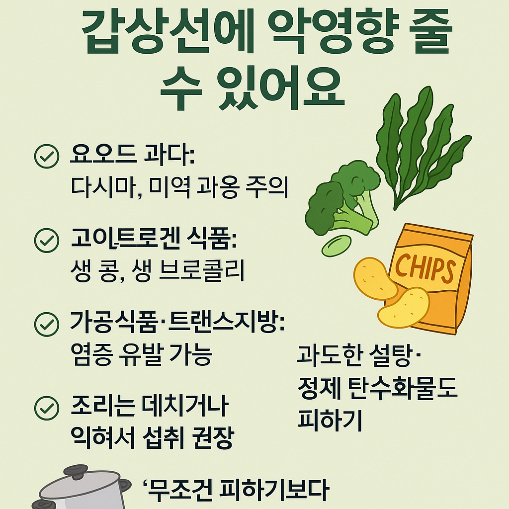 - 과도한 요오드 식품: 다시마, 미역 등 해조류는 적정량만 섭취 (한국인은 과잉 섭취 경향 있음)