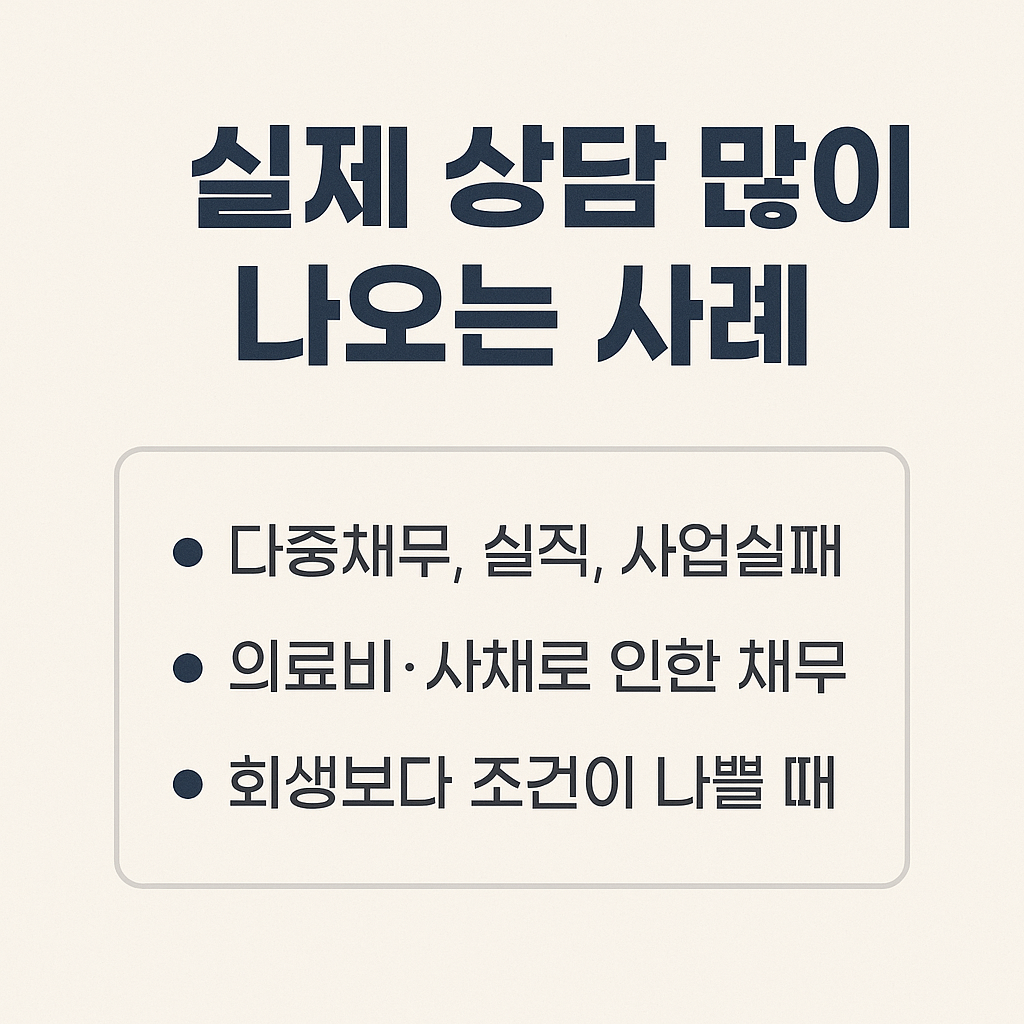 - 다중 채무 상황 – 금융권 외에도 카드론, 사채, 가족 지인에게까지 빚이 있는 경우