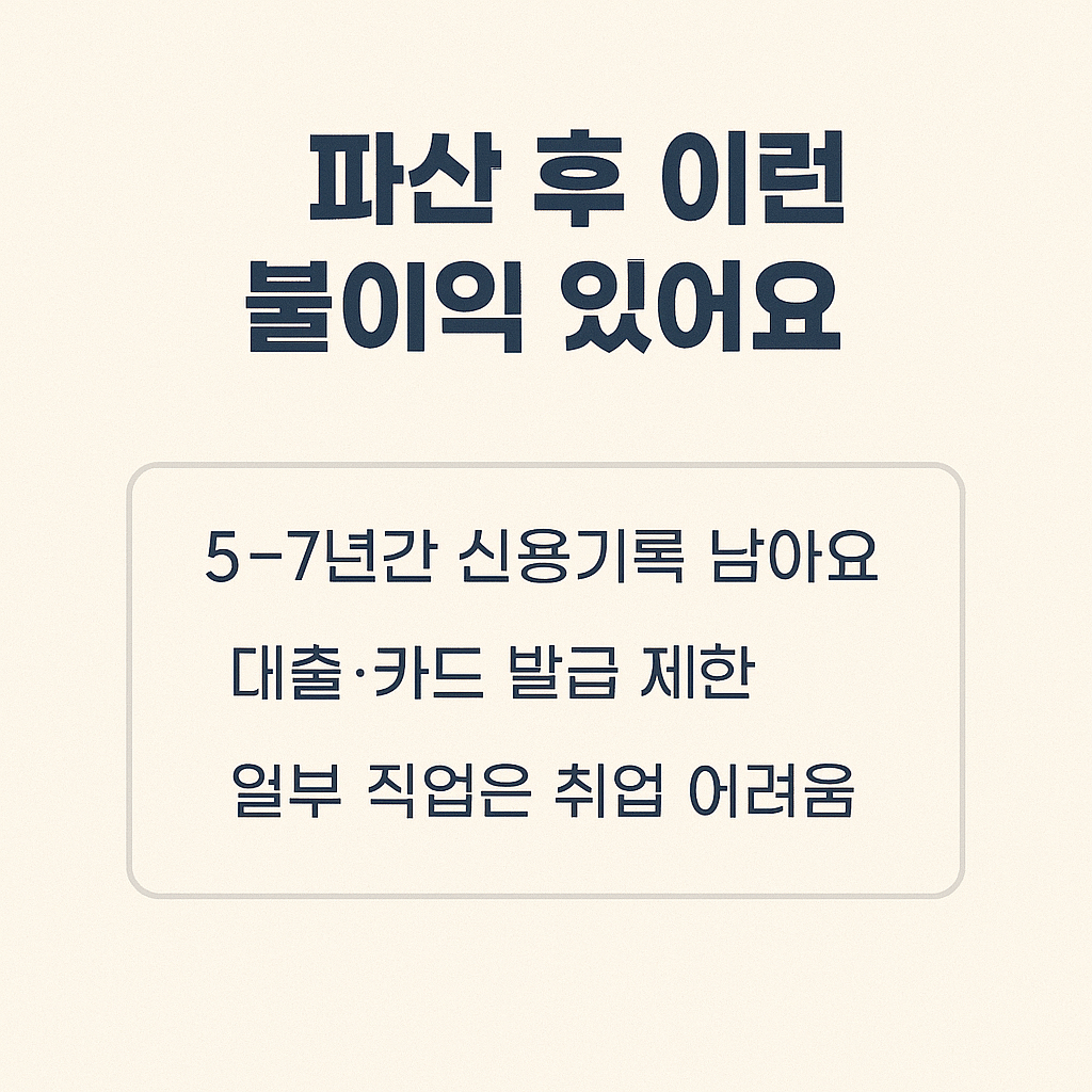 - 개인신용정보 등록: 파산 기록은 KCB 및 나이스 등 신용평가기관에 5년~7년간 등록