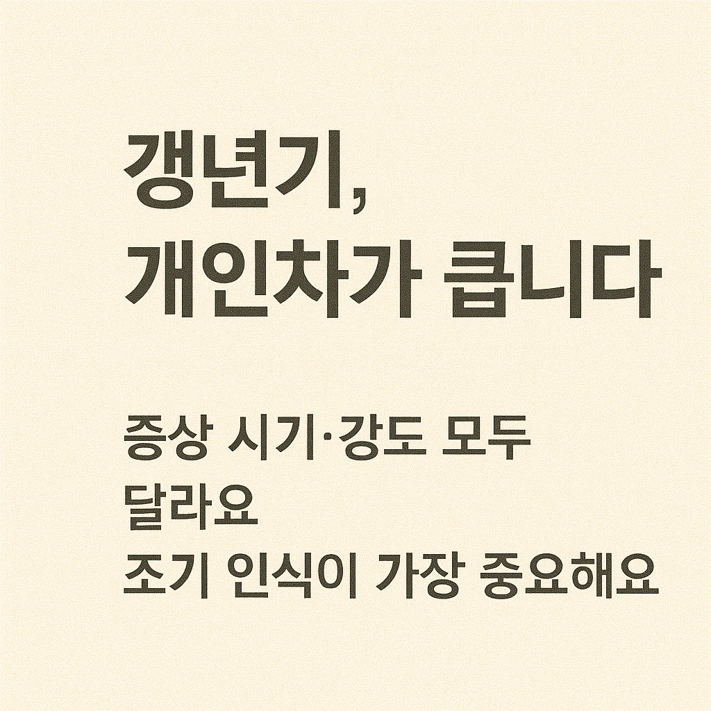 갱년기 증상은 사람마다 발현 시기, 강도, 지속 기간이 크게 다릅니다. 어떤 사람은 가벼운 안면홍조만 겪는 반면, 어떤 사람은 감정 기복과 우울증까지 동반하기도 합니다. 특히 여성은 폐경 전후 약 2~5년간 증상이 가장 심하게 나타나는 반면, 남성은 40대 중반부터 60대 이후까지 점진적으로 증상이 지속될 수 있습니다.