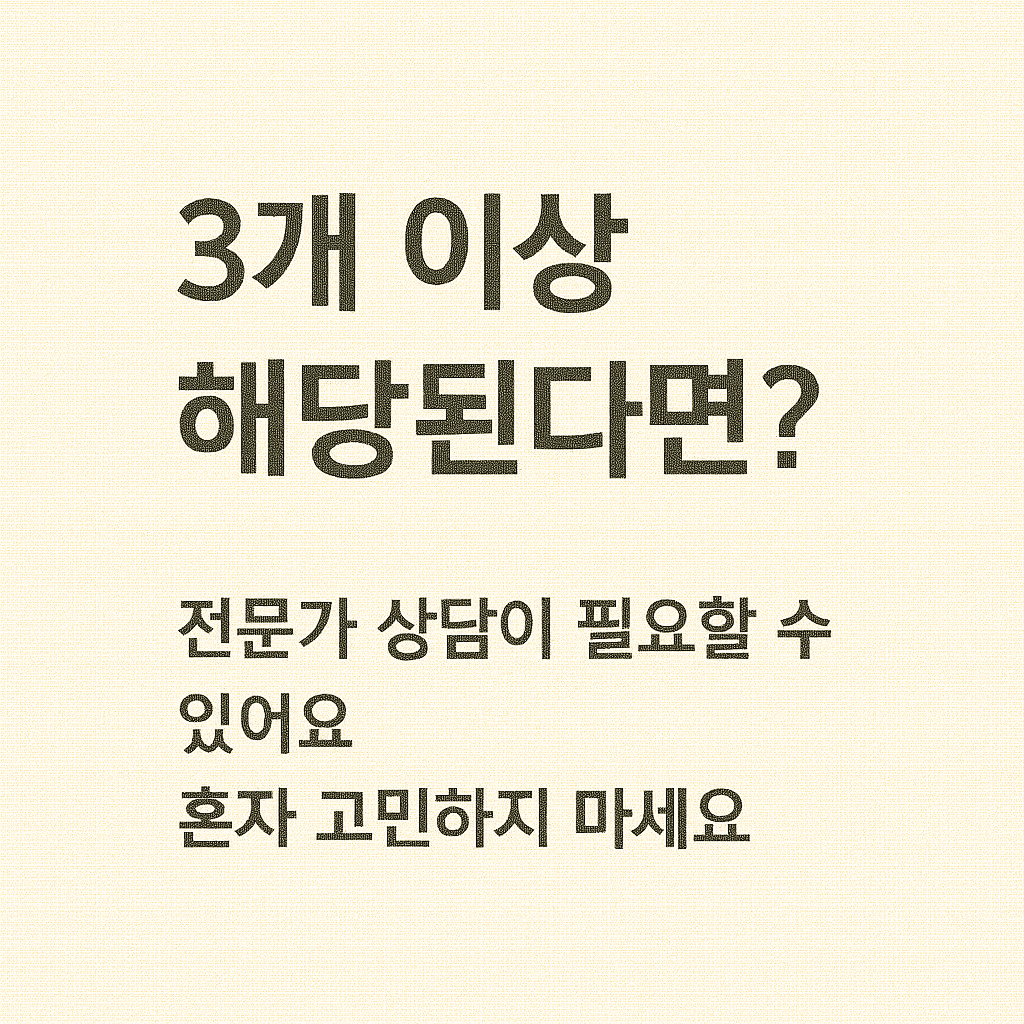 자가진단 체크리스트를 통해 현재 상태를 객관적으로 점검하고, 필요시 전문 상담이나 진료를 받는 것이 좋습니다.