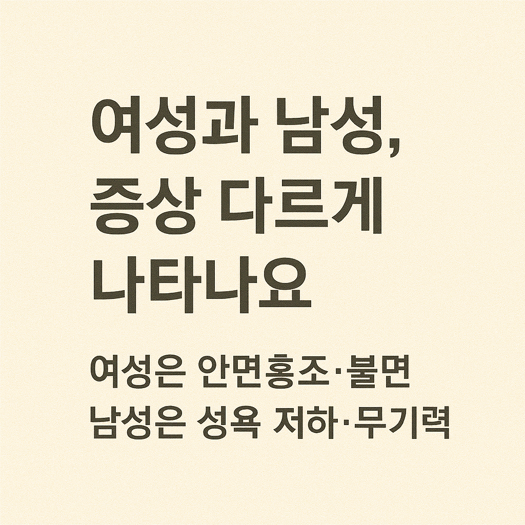 | 대표 증상 | 안면홍조, 발한, 질건조, 우울 | 성욕 저하, 피로, 우울, 복부 비만 |