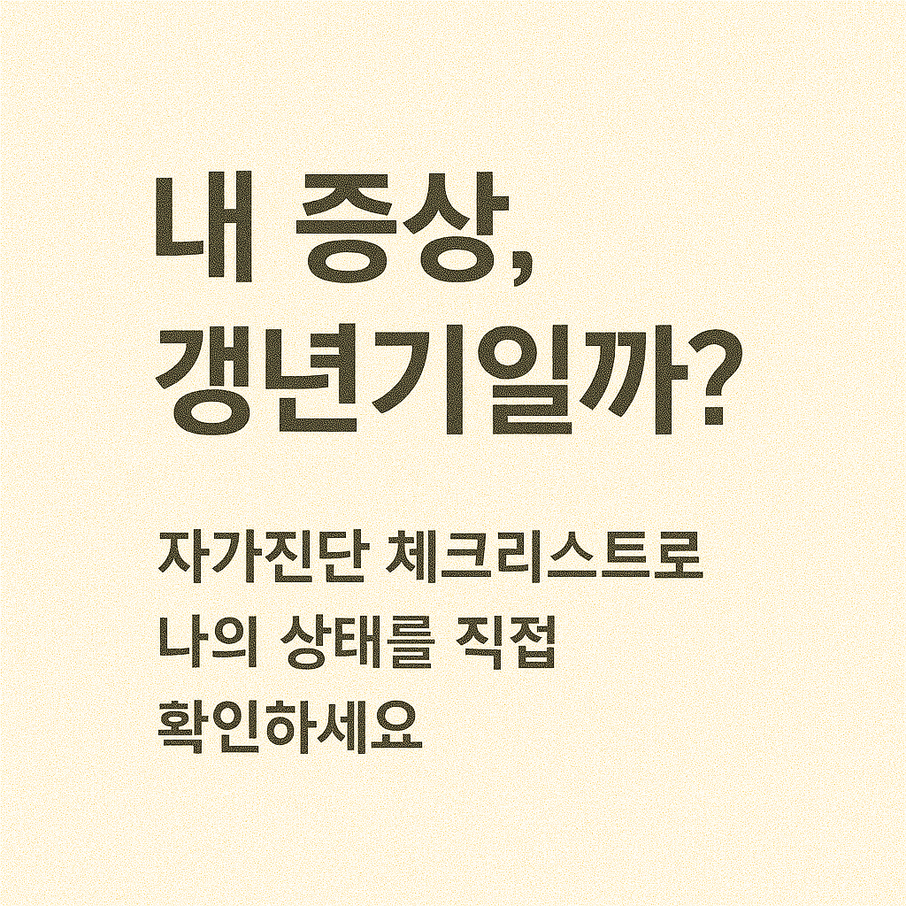 갱년기는 개인차가 크기 때문에, 본격적인 진단 전 단계에서 스스로 증상을 파악해 보는 것이 매우 중요합니다. 자가진단은 병을 진단하는 수단이 아닌 ‘도움이 필요한 시기인지’ 확인하는 데 큰 역할을 합니다.