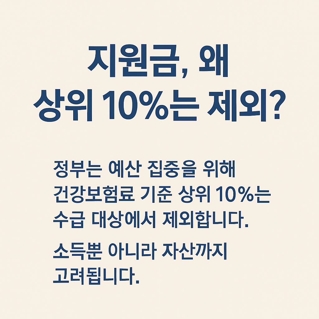 특히 다음 이유로 인해 건강보험료 기준 소득상위 10%는 주요 제외 대상이 됩니다.