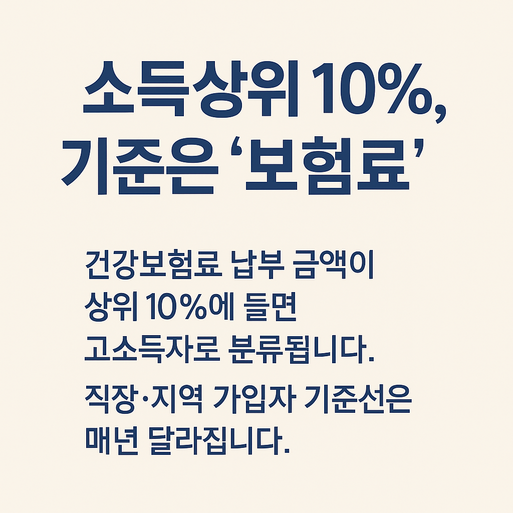 이때 ‘소득상위 10%’ 기준은 전체 가입자 중 보험료 납부금액이 상위 10%에 속하는 구간을 의미하며, 이는 매년 전체 납부자 자료를 기반으로 산출됩니다. 즉, ‘내가 상위 10% 인지’는 내 소득 자체보다 납부 건강보험료가 전체에서 어느 위치에 있는지를 따져보는 것이 핵심입니다.