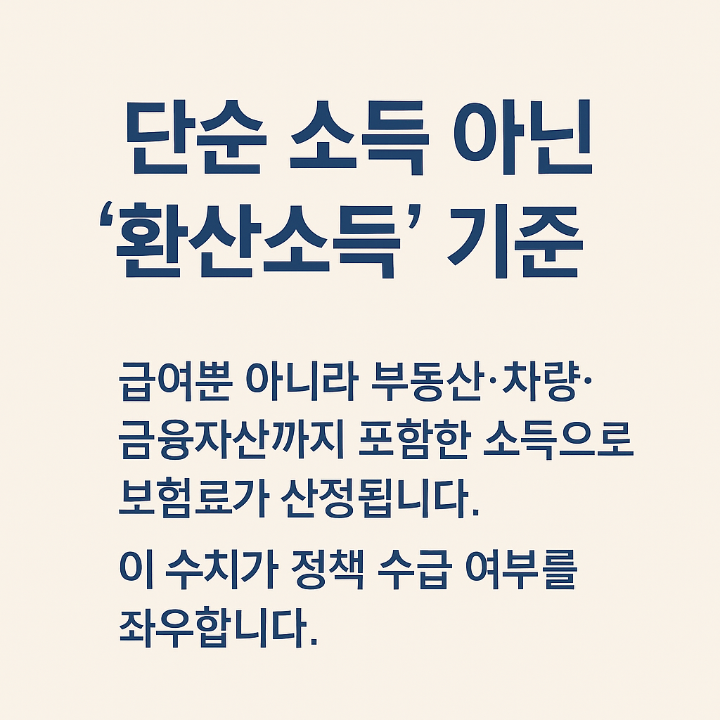 - 급여뿐 아니라 재산·차량·금융소득까지 고려되어 환산소득 산정