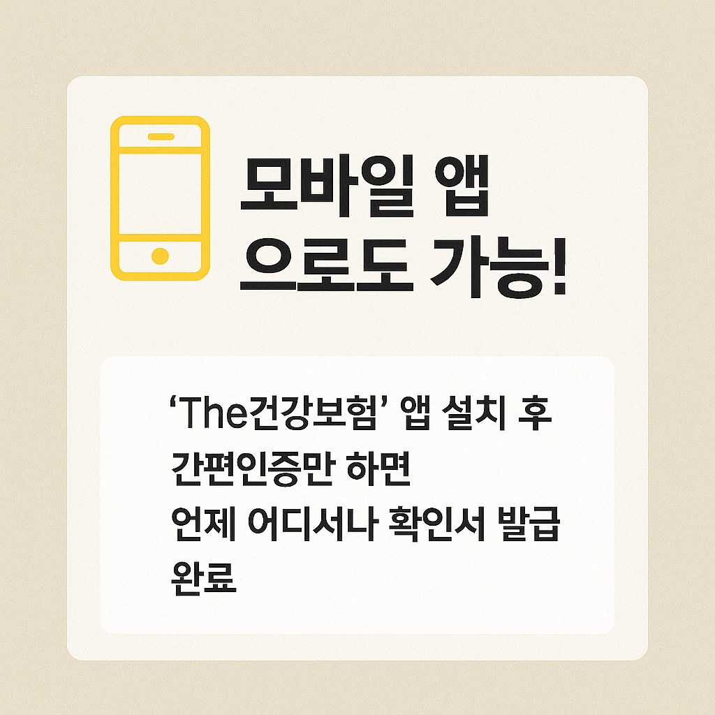 | 모바일 앱 (The건강보험) | 앱스토어 설치 → 로그인 → 증명서 메뉴 | 모바일 환경에 최적화, 간편 발급 |