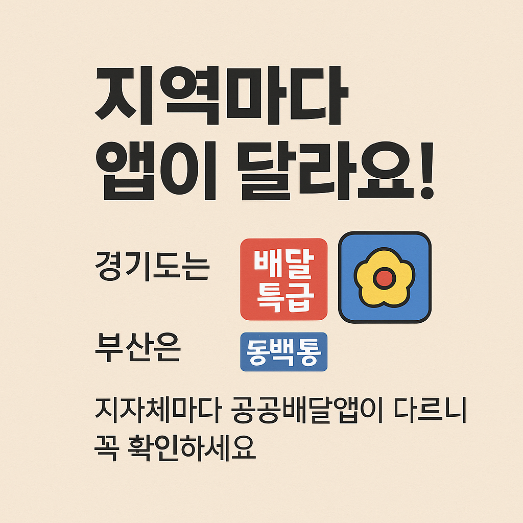 - 대표적인 공공배달앱에는 경기도의 ‘배달특급’, 부산 ‘동백통’, 대전 서구의 ‘배달서구’ 등이 있으며, 지역마다 지정된 앱이 다릅니다.