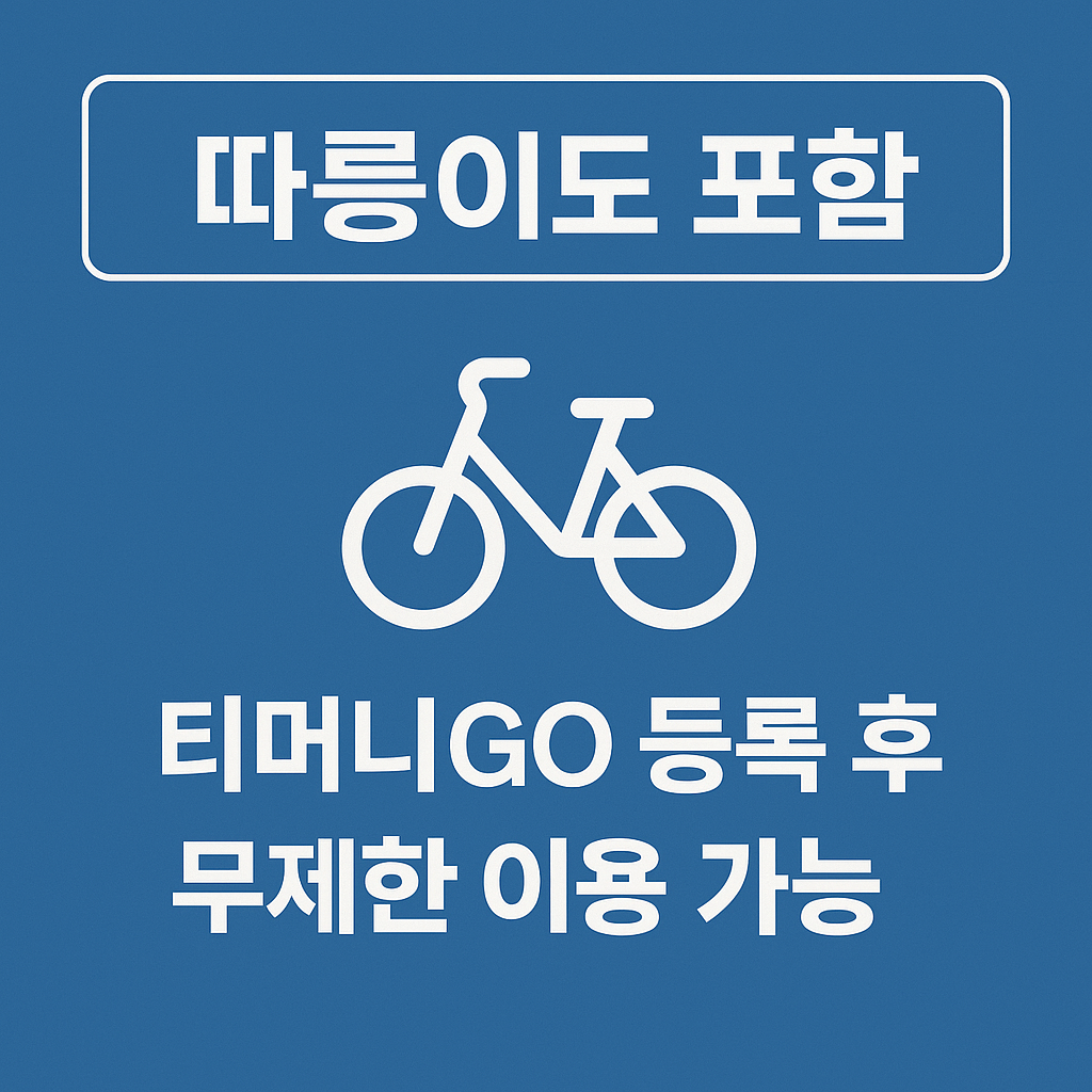 - 따릉이: 티머니GO 앱 등록 후 1시간 단위 무제한 이용, 초과 시 반납 후 재이용 필요