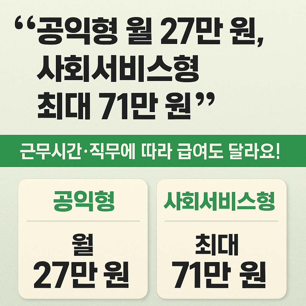 | 사회서비스형 | 주 15시간 이상 | 약 71만 원 | 최저임금 기준 | 4대 보험 적용 |