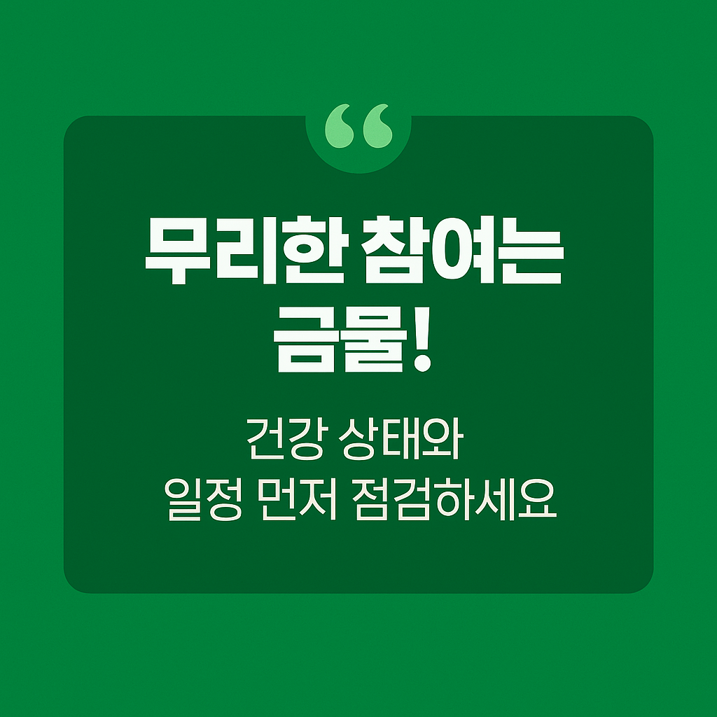 - 건강 상태 확인 - 만성질환, 관절통, 심혈관 질환 등이 있는 경우 활동 유형에 제한이 있을 수 있음