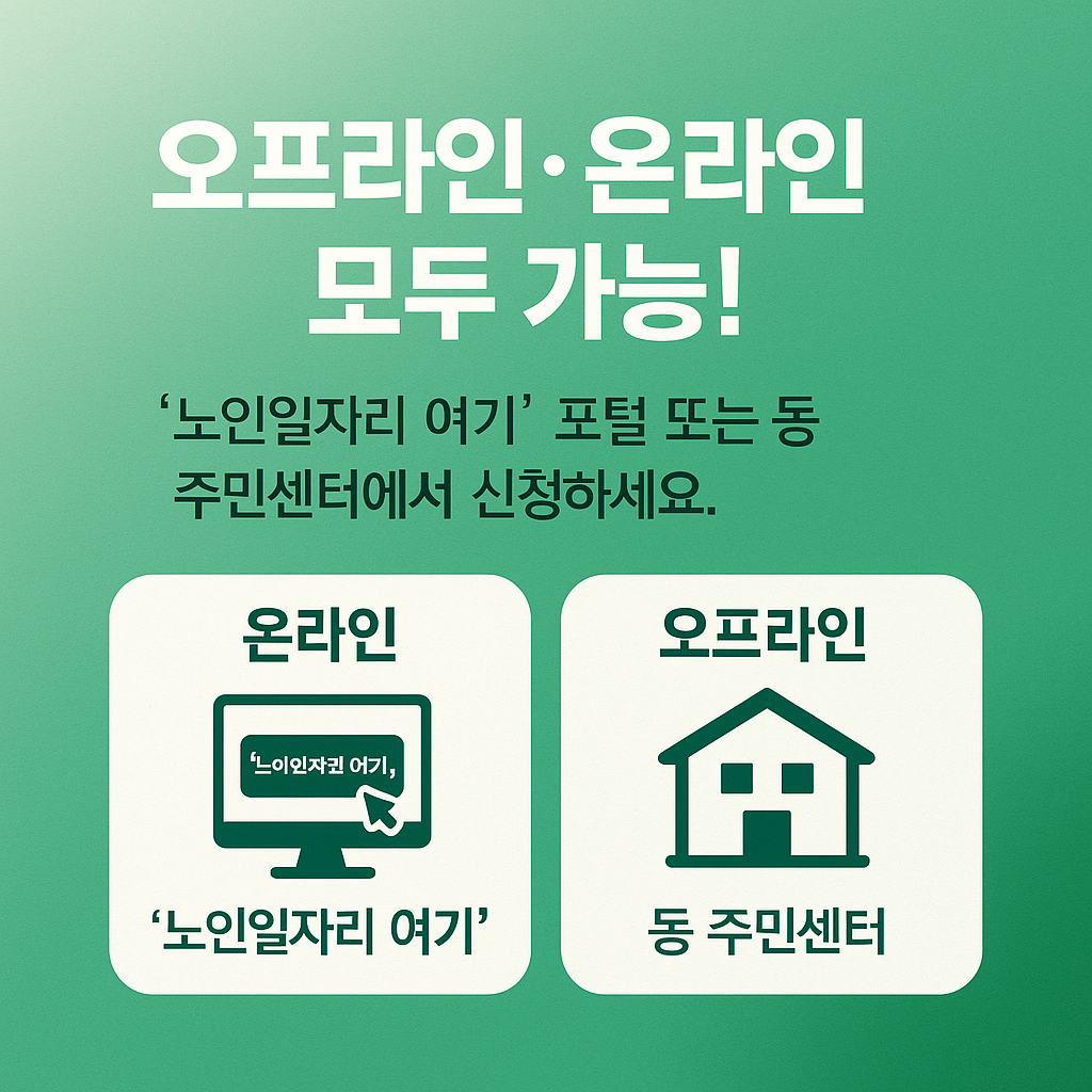 노인일자리 신청은 오프라인 및 온라인 모두 가능하며, 다음과 같은 절차를 따릅니다.
