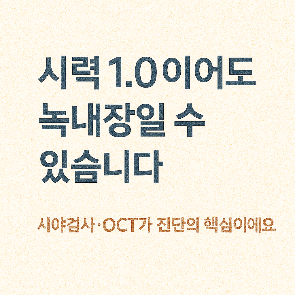 녹내장은 시력에 문제가 없더라도 시야에 이상이 생기는 ‘조용한 실명’ 질환으로, 정기적인 시야 검사와 시신경 검진 없이는 진단이 어렵습니다. 따라서 40세 이상이거나 고위험군(가족력, 고도근시, 당뇨 등)에 속하는 경우, 증상이 없더라도 1년에 한 번은 전문 안과에서 정밀 검진을 받는 것이 권장됩니다.