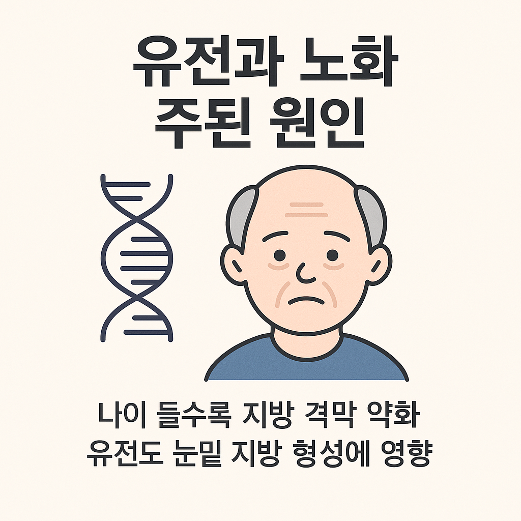 - 노화: 눈 아래 지방을 지탱하는 격막이 약해지고, 피부 탄력이 떨어지며 지방이 앞으로 밀려 나옴