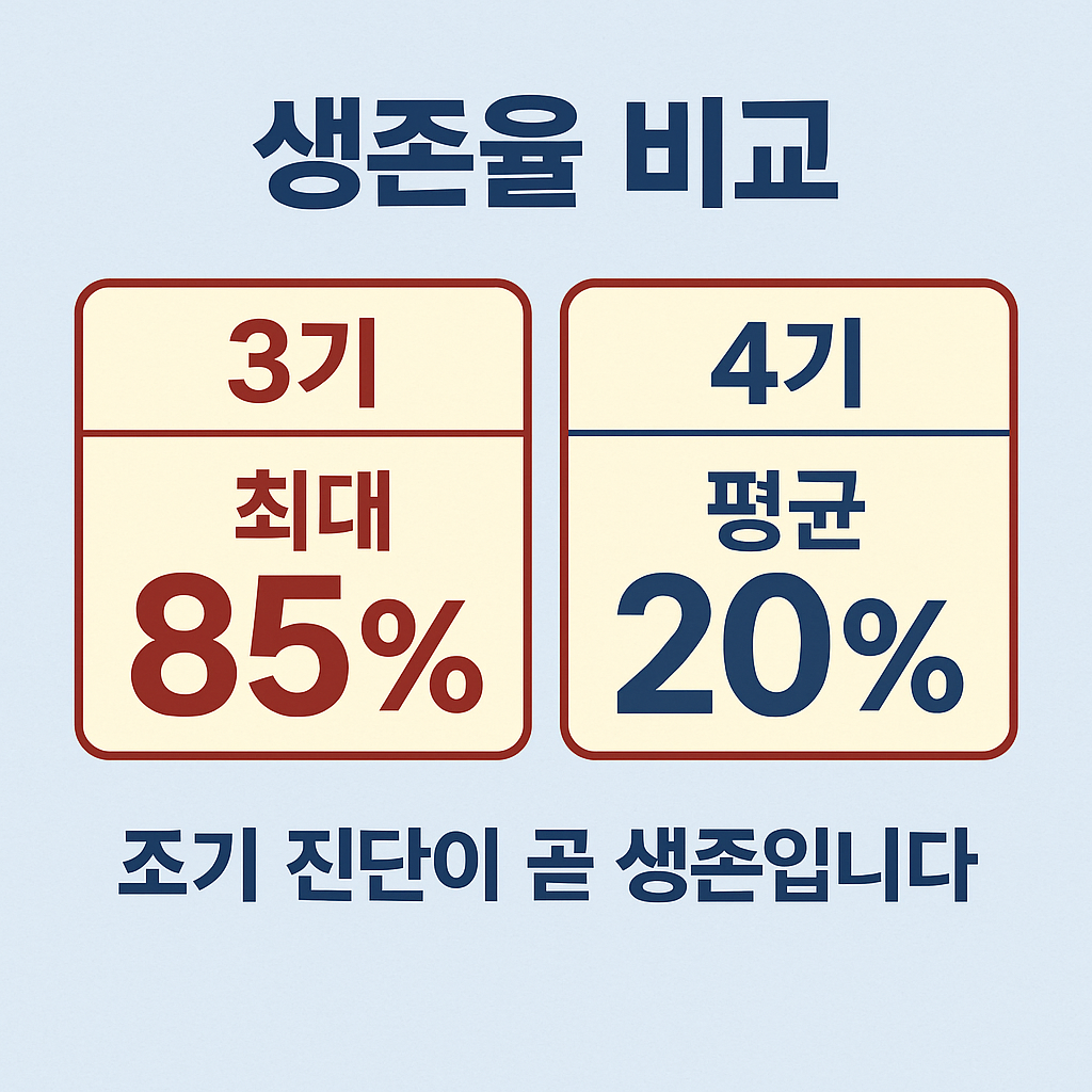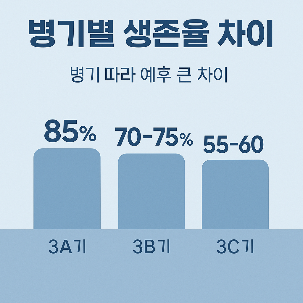 위 표를 보면 알 수 있듯, 3기에서 4기로의 전이는 생존율이 30~60% 이상 하락하는 중대한 변화입니다. 이는 조기 발견과 병기 상승 억제가 얼마나 중요한지를 보여줍니다. 특히 4기의 경우 재발률도 매우 높고, 전이 부위에 따라 생존 기간이 크게 달라질 수 있습니다.