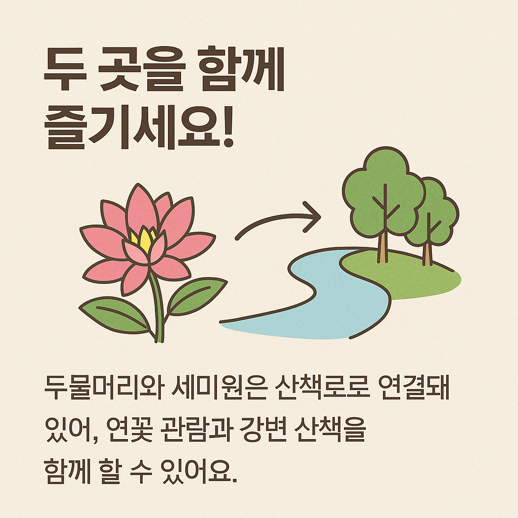 두물머리와 세미원은 위치적으로 바로 인접해 있으며, 두물머리에서 세미원으로 바로 입장할 수 있는 도보 통로가 연결되어 있어 두 곳을 함께 묶어서 ‘두물머리 연꽃 축제’라고 부르기도 합니다. 이처럼 지리적 근접성과 풍경적 연계성으로 인해 많은 방문객이 두 곳을 함께 방문합니다.