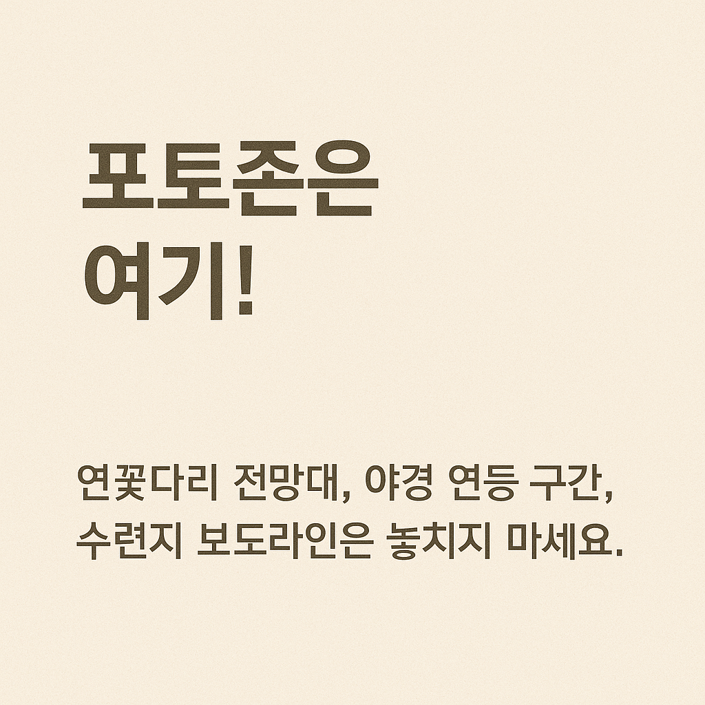 - 7월 중순~하순: 연꽃 절정, 야간 조명까지 포함된 베스트 시기