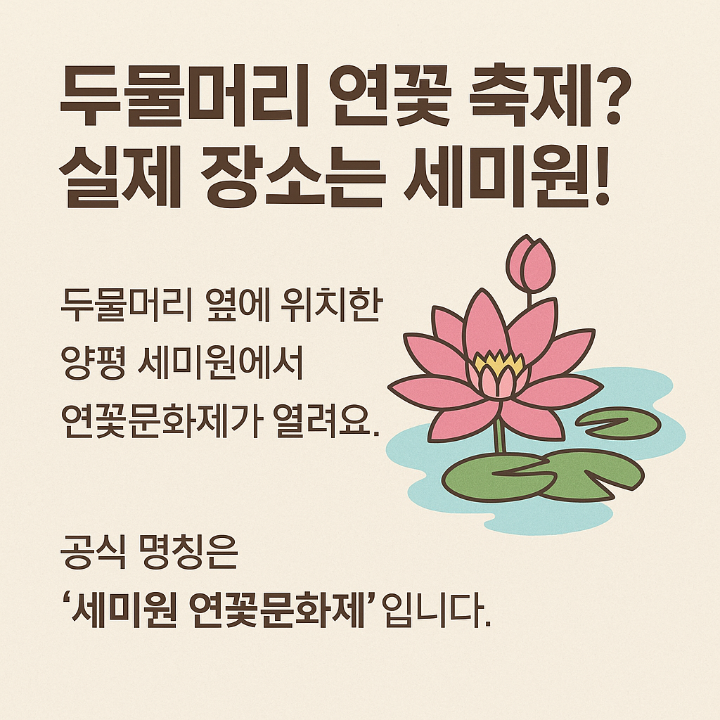매년 여름이면 ‘두물머리 연꽃 축제’라는 검색어가 포털사이트 상위를 차지합니다. 하지만 이 명칭은 공식적인 축제명이 아니라, 실제로는 양평군 양서면에 위치한 세미원에서 열리는 ‘세미원 연꽃문화제’를 지칭하는 표현입니다.