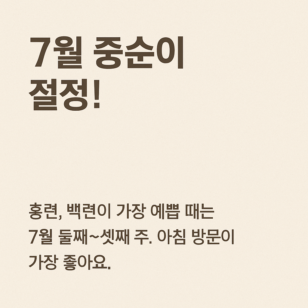 - 6월 말~7월 초: 이른 개화, 인파 적고 한적한 관람 가능
