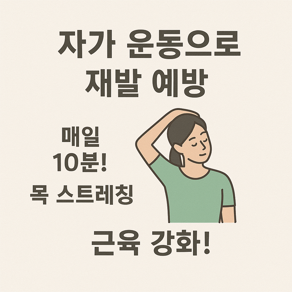자가 운동은 일상 속에서 실천할 수 있는 치료의 연장이며, 근육의 경직을 풀고 경추의 움직임을 회복하는 데 효과적입니다.