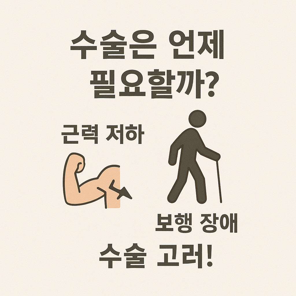 수술 결정은 단순히 통증만으로 내리지 않으며, MRI·신경학적 검사·기능 검사 등 종합적인 결과를 바탕으로 의료진과 충분한 상담 후 결정되어야 합니다.