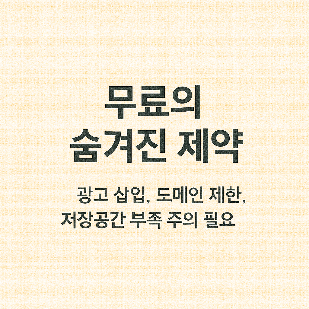 username.platform.com형태의 서브도메인만 제공합니다. 독자 도메인을 사용하려면 유료 업그레이드가 필요합니다. - 트래픽 및 저장공간 제한하루 방문자 수가 많거나 이미지·영상 콘텐츠가 많을 경우 속도 저하 또는 접속 차단이 발생할 수 있습니다.
