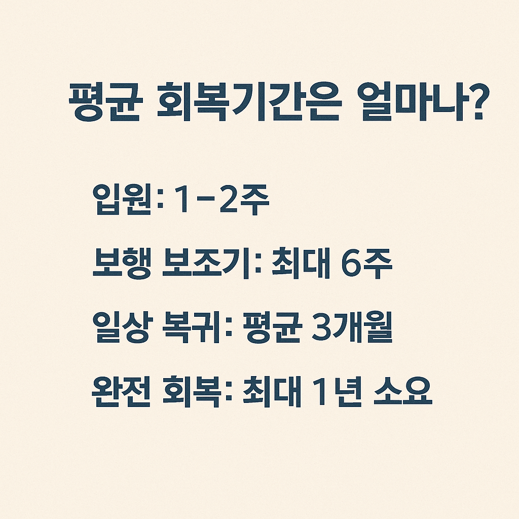 - 재활 참여도: 적극적으로 물리치료와 홈 트레이닝을 병행할수록 회복이 빠릅니다.