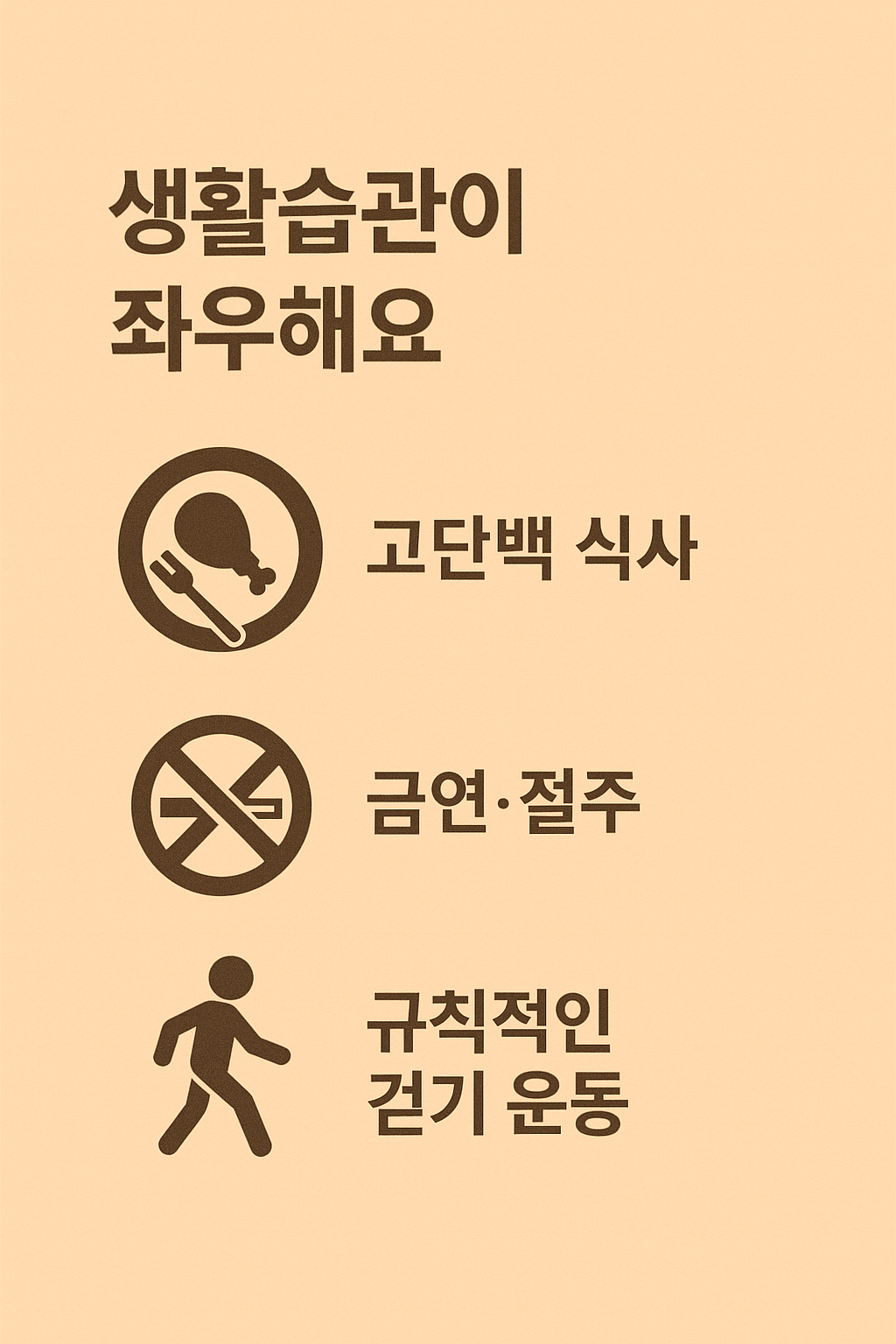 | 고단백 식단 | 근육 회복에 필요한 단백질 및 칼슘, 비타민 D 섭취 |