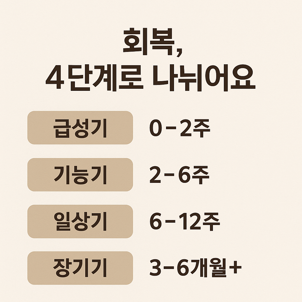 | 입원 및 초기 치료기 | 1~2주 | 수술 후 통증 관리 및 기본 움직임 확보 |