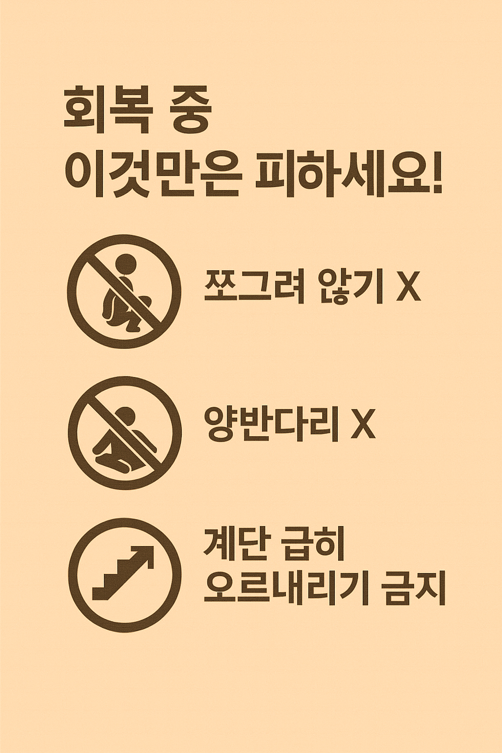 - 쪼그려 앉기: 무릎에 과도한 굽힘을 유발해 인공관절 이탈 가능