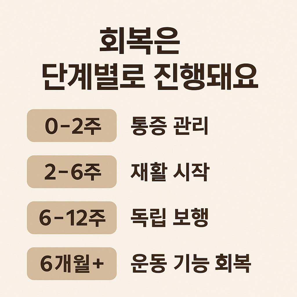 | 기능 회복기 | 6~12주 | 스스로 걷기, 일상 동작 점진적 복귀 |