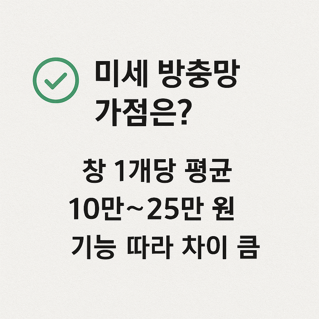 | 스테인리스 미세 방충망 | 10만 ~ 15만 원 | 내구성 우수, 녹슬지 않음, 장기 사용 가능 |