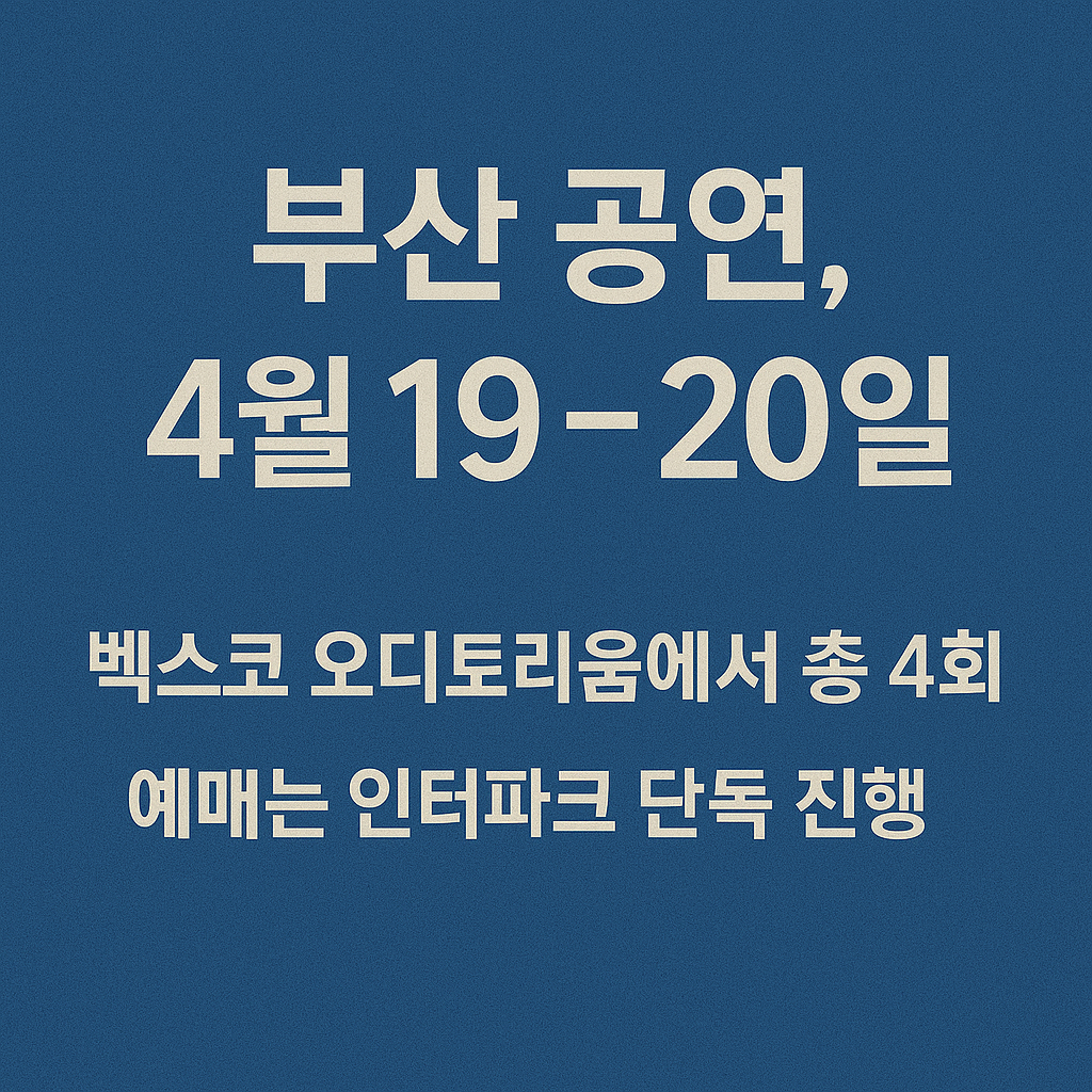 | 부산 | 4월 19일(토) ~ 20일(일) | 1시 / 6시 | 벡스코 오디토리움 |