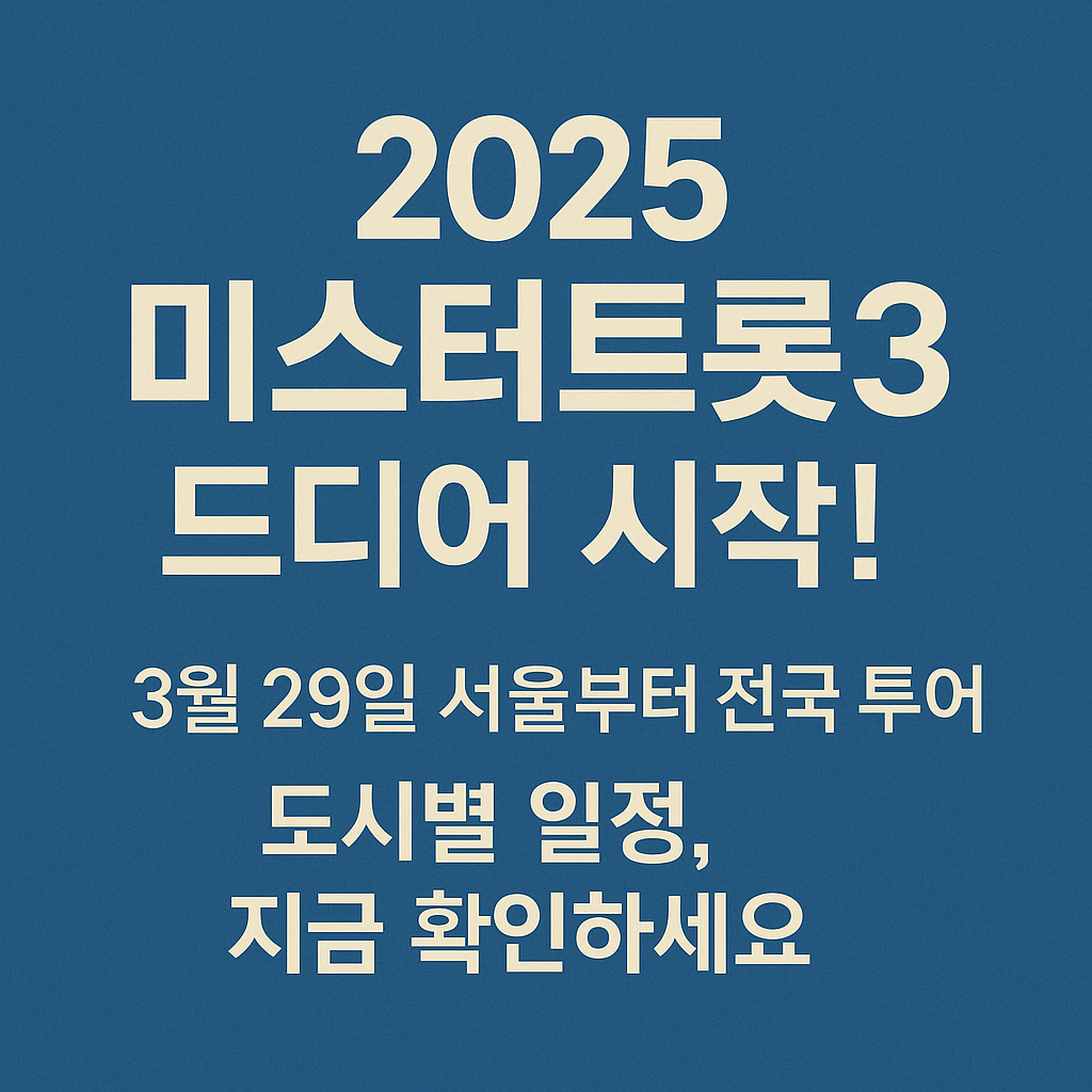 2025년 미스터 트롯 3콘서트 일정은 서울을 시작으로 부산, 대구, 광주, 대전, 창원, 수원, 고양 등 전국을 순회하는 초대형 투어 콘서트입니다. 트롯 팬이라면 누구나 한 번쯤 현장을 직접 경험하고 싶어하는 공연인 만큼, 일정 확인과 예매 준비가 매우 중요합니다.