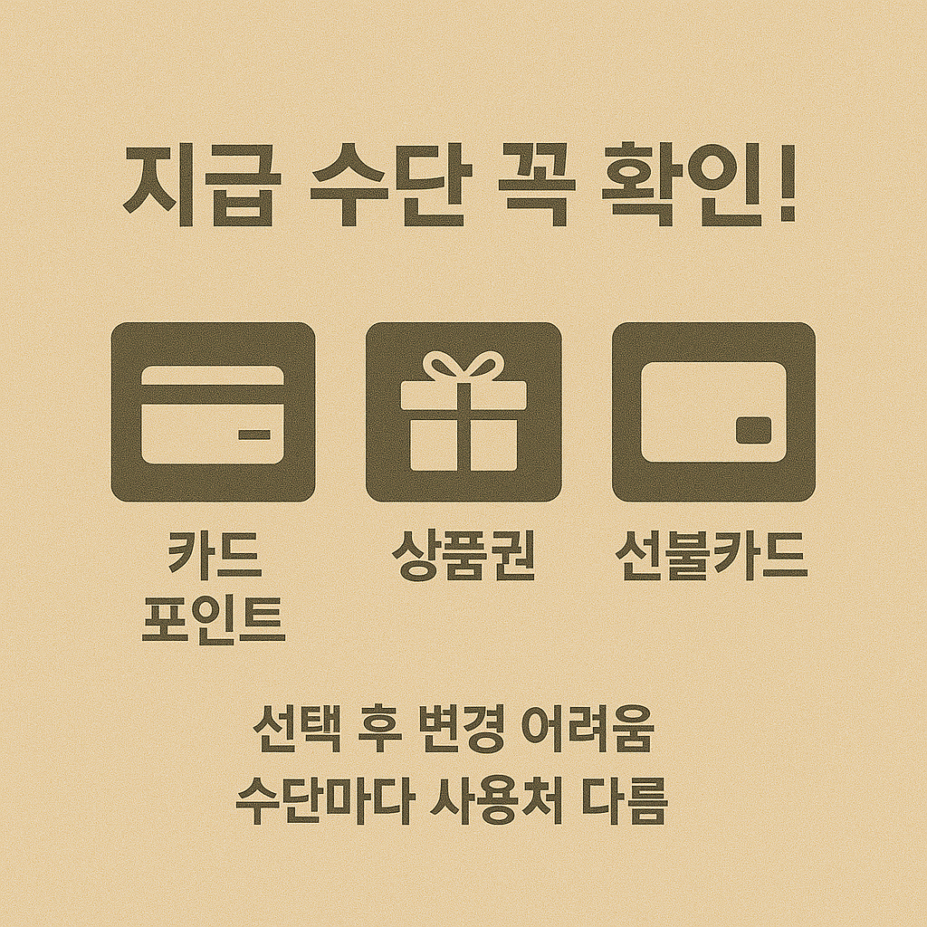 - 지급 수단에 따라 사용 방식이 다름 (포인트 / 상품권 / 카드)