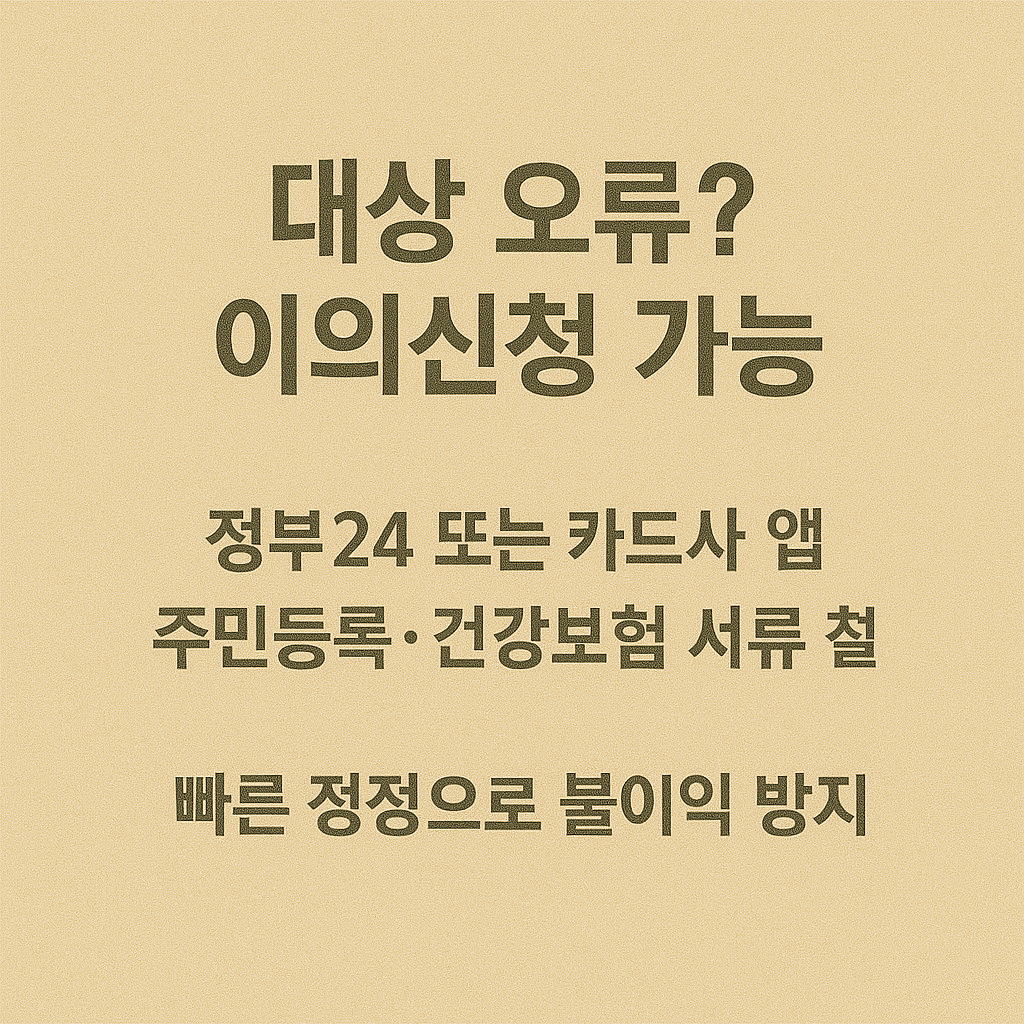 - 대상 오류 시 이의신청 가능 → 건강보험료, 주민등록서류 필요