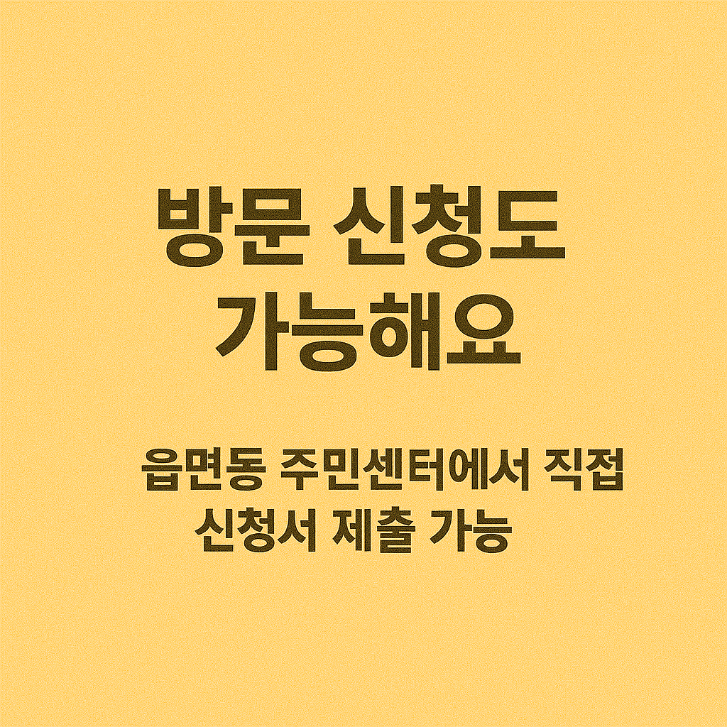 | 오프라인 방문 신청 | 주소지 읍·면·동 주민센터 방문 | 신분증, 통장 사본, 소득증빙서류, 위임장(대리 신청 시) |
