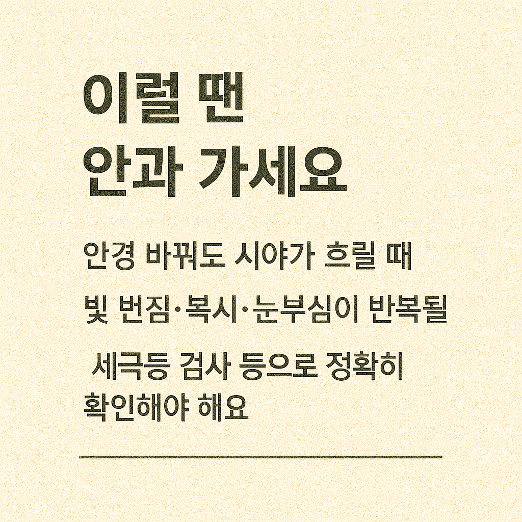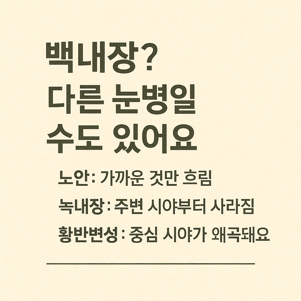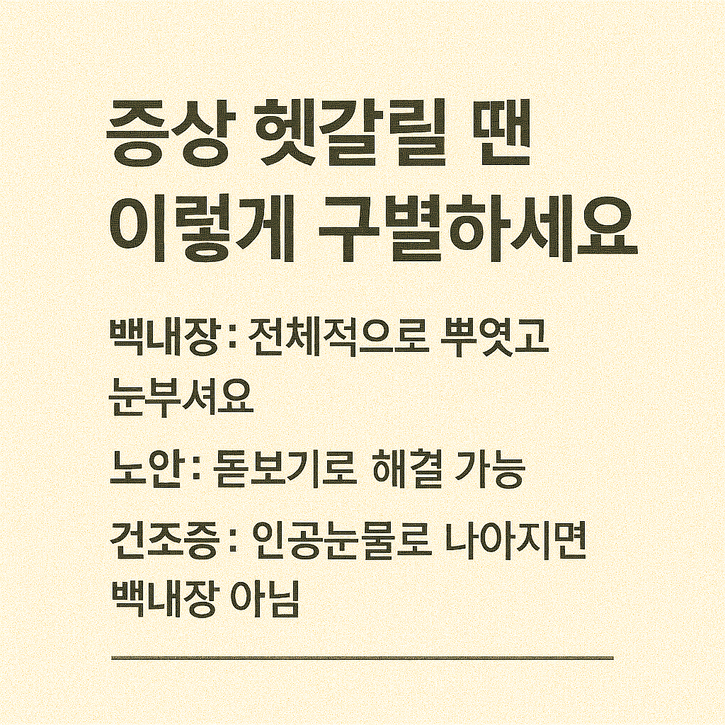 - 노안은 빛 번짐이나 색감 변화 없음, 백내장은 동반 증상 다수