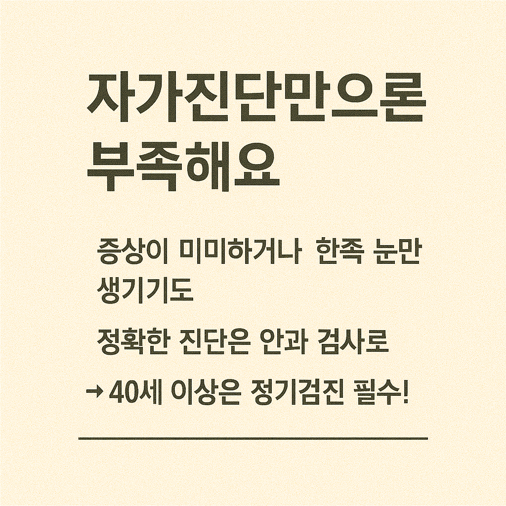 자가진단은 어디까지나 참고용이며, 실제 백내장 진행 여부는 전문의의 검사를 통해서만 확인할 수 있습니다. 특히 60세 이상에서는 증상이 없더라도 1~2년에 한 번은 정기적인 안과검진을 받는 것이 좋습니다.