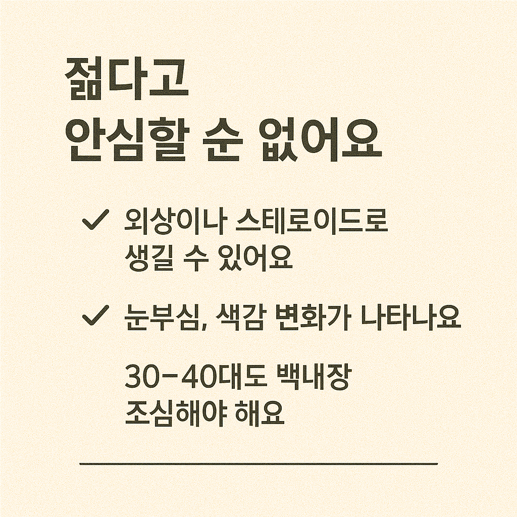| 20~40대 | 눈부심, 시야 흐림, 색감 저하 | 외상성, 약물성 백내장이 많음 |