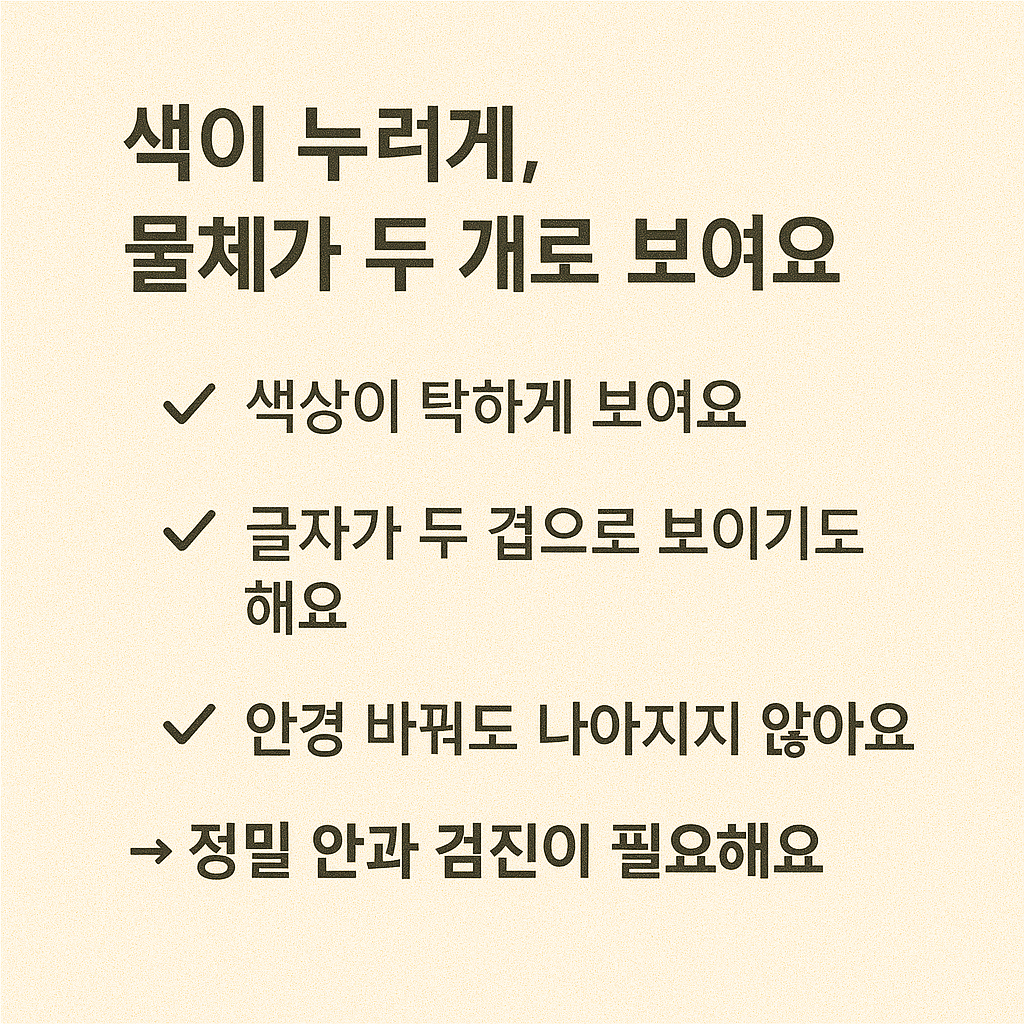 - 색감 변화: 사물이 노랗거나 탁하게 보임