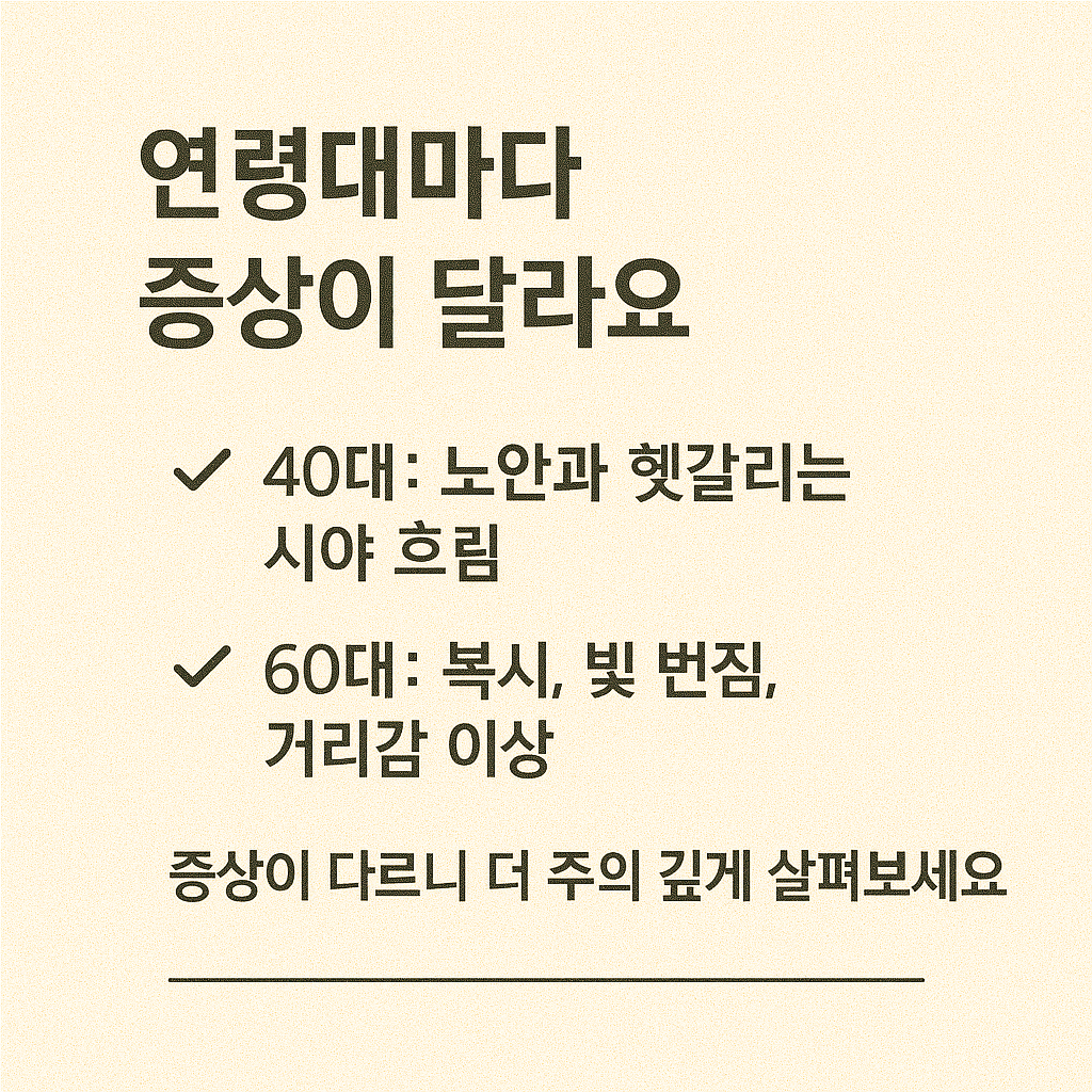 | 40~60대 | 가까운 시력 변화, 눈의 피로감, 야간 시력 저하 | 노안과 혼동 쉬움 |