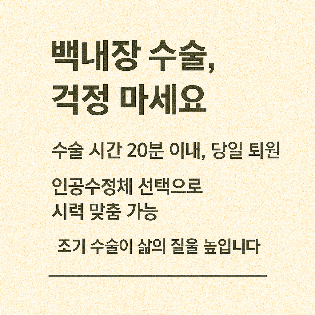 눈은 한 번 손상되면 회복이 어려운 기관입니다. 지금 느끼는 작은 흐림과 불편함이 백내장의 신호일 수 있습니다. 더 이상 ‘나이 탓’이라 넘기지 말고, 조기 인식과 적극적인 대응으로 건강한 시력을 오래 지켜나가시기 바랍니다.