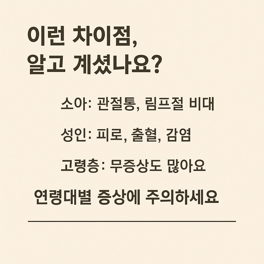 요약하면, 백혈병 초기증상은 연령대에 따라 표현 방식, 나타나는 증상, 오인 가능성까지 모두 다릅니다. 다음은 핵심 비교입니다: